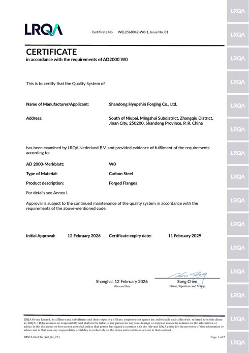 · Certification Body:Lloyd's (LRQA); · Certificate Scope:Manufacturing of Forged Flanges, See annex to certificate; · Certificate No.WEL2568042-W0-1, Issue No. 01; · Certificate Verifying Page:https://www.lrqa.com · See what steel materials have certified